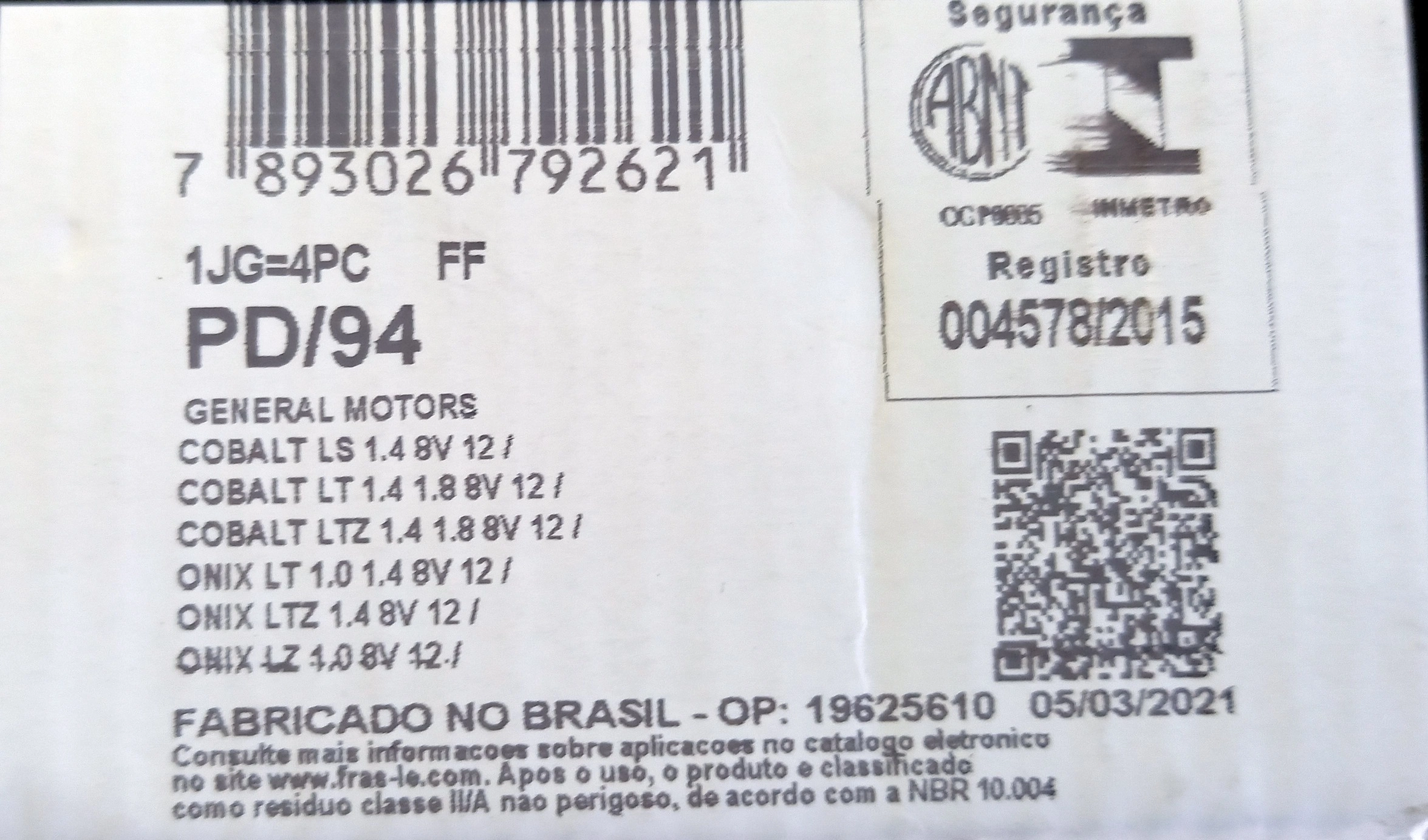PASTILHA DE FREIO GM COBALT 1.4/1.8 2012/ S/ABS - ONIX 1.0/1.4 2012/ - NOVO PRISMA 2013/ - DIANTEIRA
